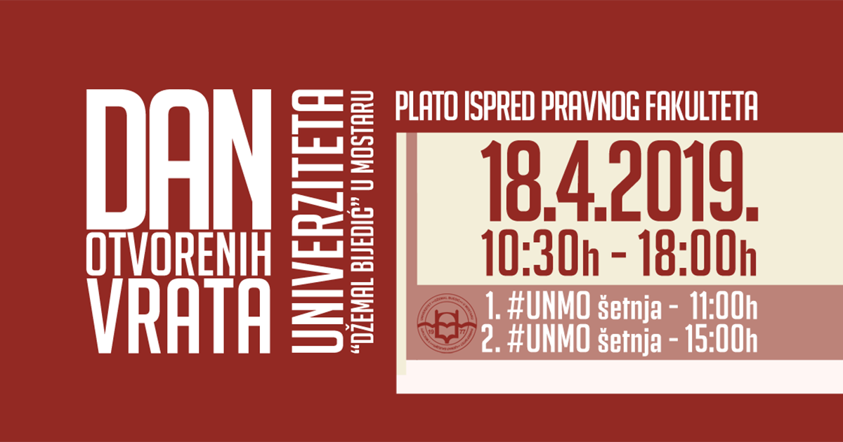 Sa radošću pozivamo maturant(ic)e, roditelje, nastavno osoblje srednjih škola i sve zainteresovane da posjete Univerzitet tokom Dana otvorenih vrata 2019.!Dan otvorenih vrata Univerziteta "Džemal Bijedić" u Mostaru bit će održan u četvrtak, 18. 4. 2019. godine od 10:30 h do 18:00 h.Centralno mjesto sastanka je plato ispred Pravnog fakulteta, na samom ulazu u kampus.Ovo je sjajn ...