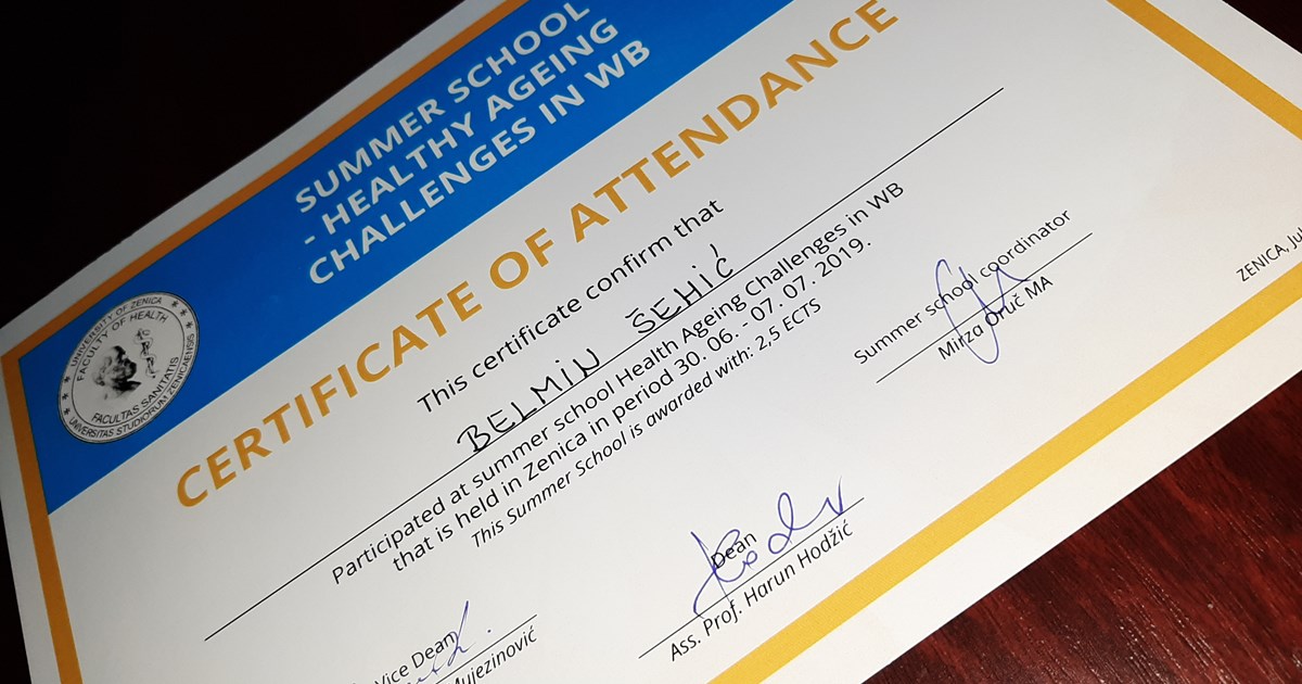 Studentima Belminu Šehiću i Adi Maksumiću Studija Zdravstvene njege "Univerzitet Džemal Bijedić" Mostar naposlijetku je dodijeljen certifikat za participaciju na ljetnoj školi - Summer School-Healthy Ageing Challenges in Western Balkan 2019 koji je nagrađen s 2.5 ECTS boda.