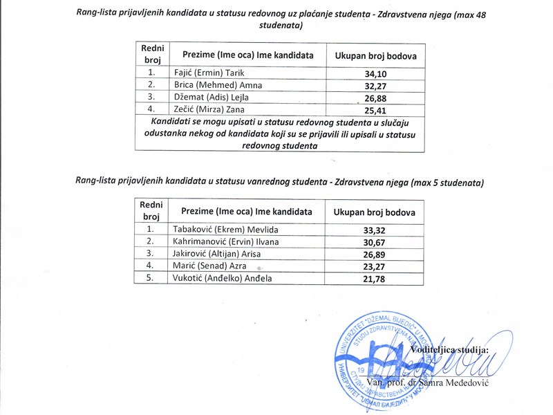 Rang lista kandidata za prijem na I ciklus Univerzitetskog studija Zdravstvena njega