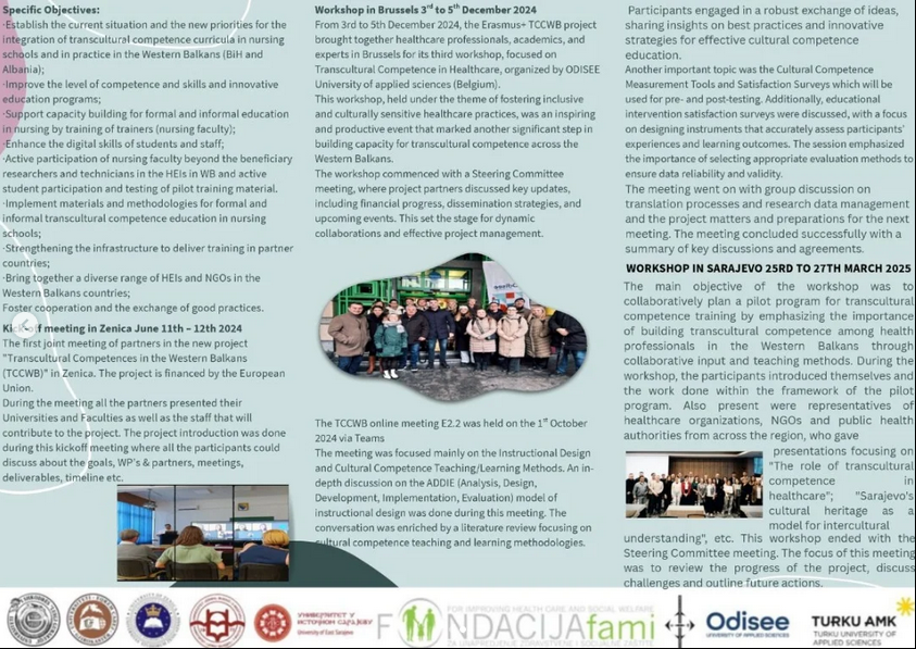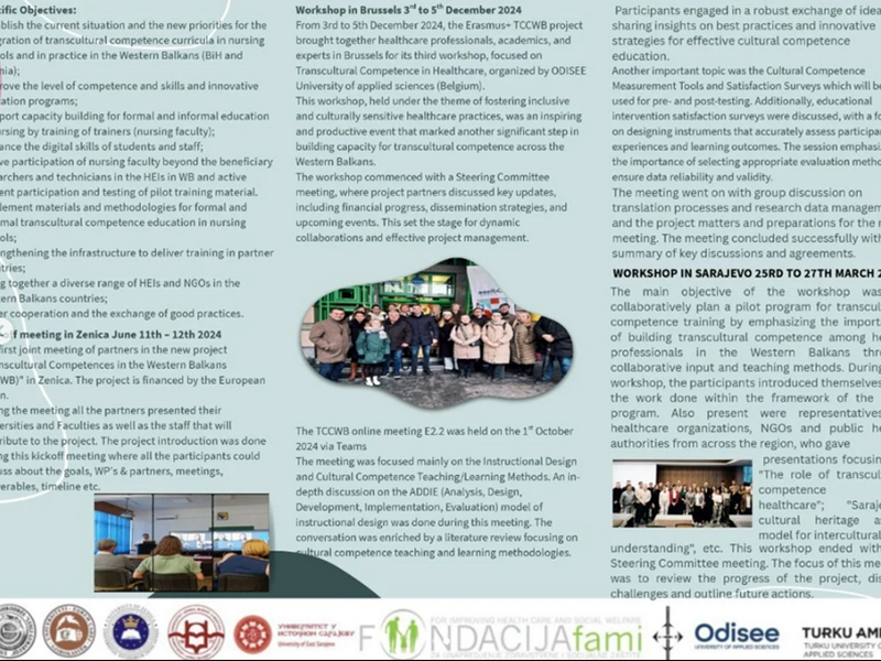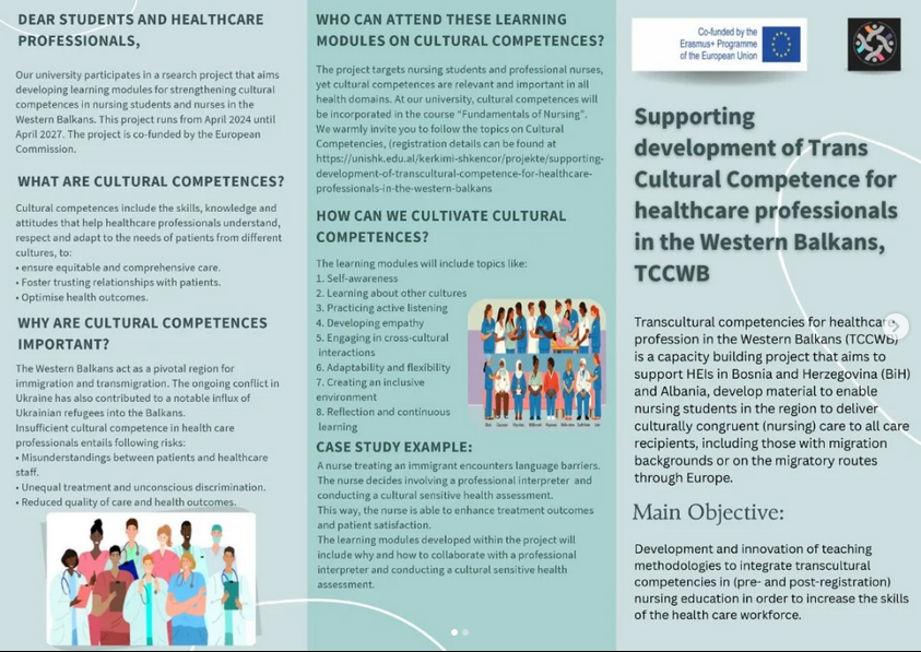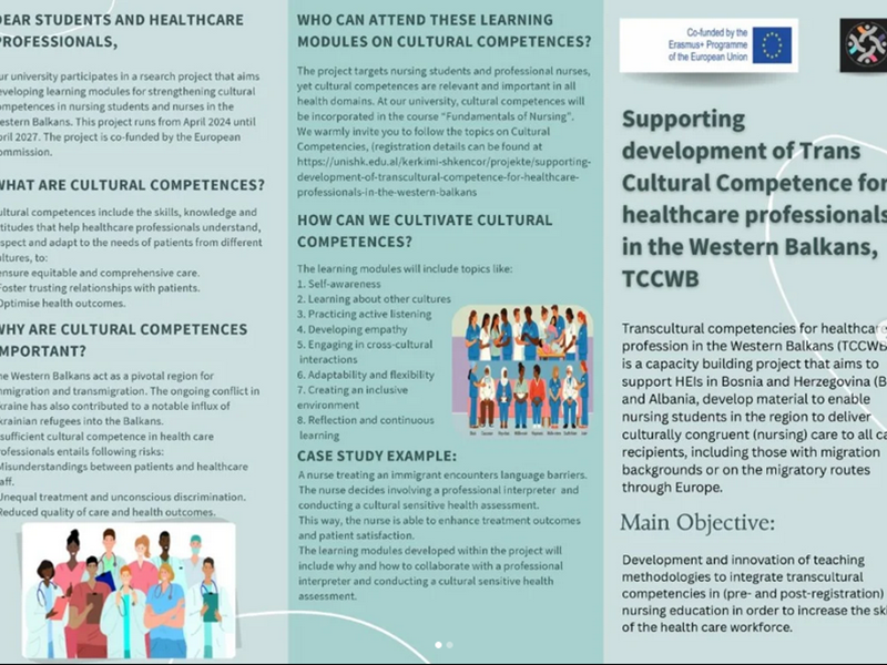 Univerzitetski studij Zdravstvena njega aktivno učestvuje u međunarodnom Erasmus+ projektu TCCWB – Transkulturne kompetencije u zemljama Zapadnog Balkana, čiji je cilj razvoj obrazovnih modula za jačanje transkulturnih kompetencija kod studenata i stručnjaka u oblasti zdravstva u Bosni i Hercegovini i Albaniji.