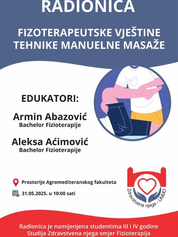 Radionica Fizioterapeutske vještine - Tehnike manuelne masaže će se održati u subotu, 31. maja 2025. godine, u 10 sati u prostorijama Agromediteranskog fakulteta Univerziteta "Džemal Bijedić" u Mostaru.